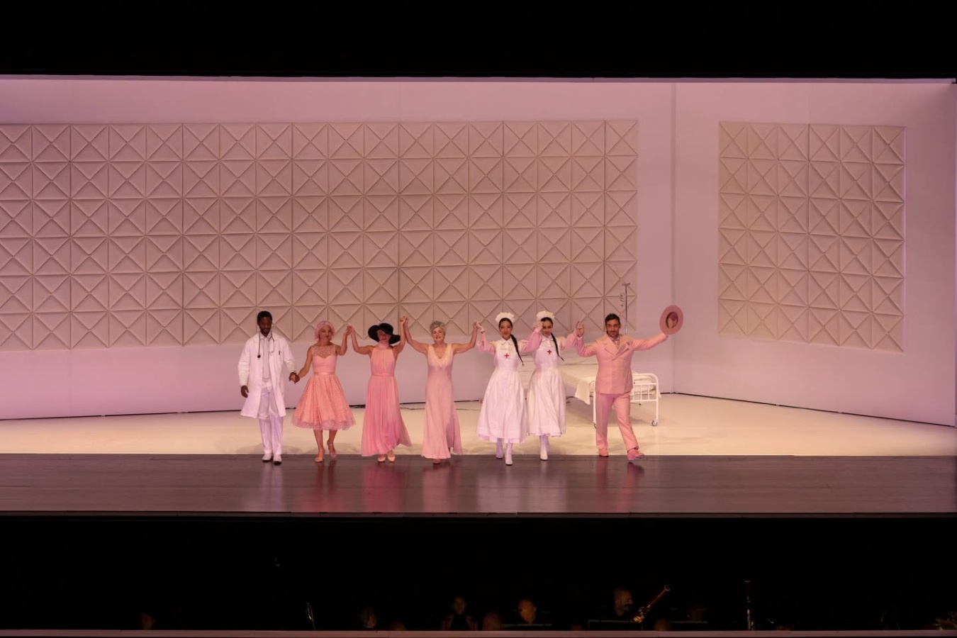 Emma Dante nella regia ripresa da Federico Gagliardi con il valente aiuto dello scenografo Carmine Maringola e dei costumi di Vanessa Sannino immagina giustamente due allestimenti molto diversi tra loro anche se pervasi dal medesimo sentore di taglio femminista, mai però esplicitato in forma diretta ma attraverso simboli e suggestioni di grande teatro. La “Voix humaine” ci introduce non in un luogo disadorno ma in una camera dalle pareti rosa con due letti e due comodini bianchi che piano piano si trasforma in un ospedale psichiatrico dove la protagonista parla con il suo ex amante da un telefono che ha il filo spezzato. Lo spazio scenico è attraversato da un medico e da due infermiere. Ma anche il passato sfiora la camera con l’apparizione dei due ex amanti felici. Nel finale ovviamente conoscendo la sensibilità di Emma Dante, il filo del telefono non si avvinghierà su di Elle ma sull’ amante. Tutto ciò avviene con profondità di intenti anche grazie alla bravura di Anna Caterina Antonacci, artista che amiamo e conosciamo da tempo che interpreta la protagonista con sensibilità straordinaria dove la voce, pur annientata dalla melanconia di un amore perduto, varia a seconda dei sentimenti tra prosa e musica.
