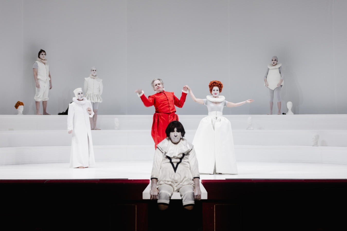 un bianco smagliante che riflette la platea, ( le scene sono di Nicolas Bovey e i costumi di Aurora Damanti ) dove bianche sono le gradinate a forma di antica cavea su cui sono posti gli attori non ancora personaggi : tutto è bianco, poche volte interrotto dal